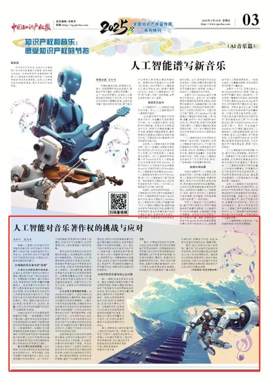 中心师生在本期专刊中发表文章《人工智能对音乐著作权的挑战与应对》,载《中国知识产权报》2025年4月18日第3版。作者:焦和平,西安交通大学法学院教授、博士生导师;梁龙坤,西安交通大学法学院博士生。