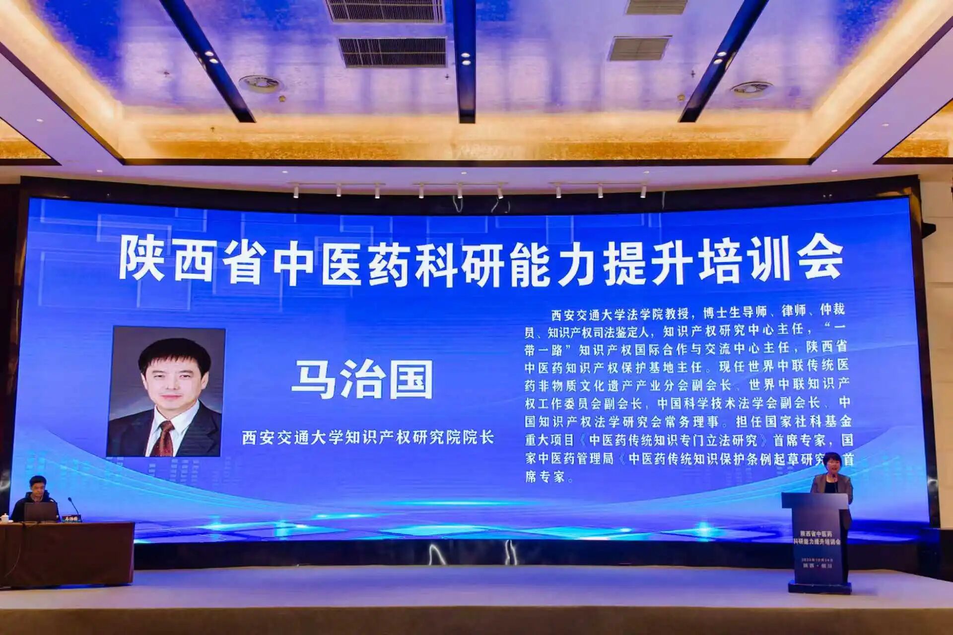 2025年10月24日,由陕西省中医药管理局主办的“全省中医药科研能力提升培训会”在铜川大厦(铜川市新区长丰南路1号)隆重举行。本次培训会由陕西省中医药管理局主办、陕西省中医药研究院承办,由省中医药局领导、特聘专家、承办单位、全省各级医疗机构、科研院所、高等院校及中药企业的百余位科研骨干300余人参加了培训会。西安交通大学知识产权研究院院长、陕西省中医药知识产权保护基地主任马治国教授作为特聘专家参会,为大会做了题为:“中医药知识产权保护与创新发展问题”的专题报告。