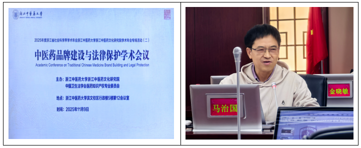 2025年11月9日,由浙江中医药大学浙江中医药文化研究院与中国卫生法学会医药知识产权专业委员会联合主办的“中医药品牌建设与法律保护学术会议”在浙江中医药大学滨文校区举行。会议汇聚了来自西安交通大学、同济大学、中国社会科学院法学研究所、南京中医药大学、湖北中医药大学、上海中医药大学、北京中医药大学、山东中医药大学等高校及科研机构的40余位专家学者,就中医药特色品牌建设路径、法律保护难点与未来发展进行深入研讨。浙江中医药文化研究院执行院长朱德明教授主持,浙江中医药大学原党委书记黄文秀教授和中国卫生法学会医药知识产权专业委员会主任委员宋晓亭教授分别致辞。西安交通大学知识产权研究院院长马治国教授受邀作为特邀嘉宾发言。