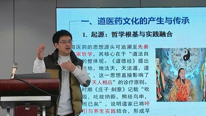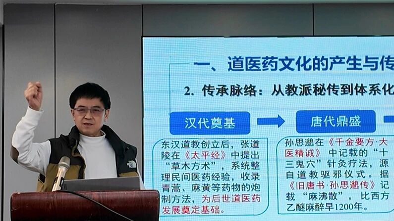 马治国教授在报告中系统梳理了道医药文化的发展脉络。他指出,道医药源于先秦道家“道法自然”思想,与中医药同源共融,在《五十二病方》《千金要方》等古籍中形成了“形神共养”“药食同源”等特色理念。他结合现代研究指出,“六字诀”呼吸法、“子午流注”理论及“小续命汤”等已获科学验证,并在焦虑缓解、慢病管理、中风康复中展现价值,葛洪《肘后备急方》启发青蒿素研发更是古籍智慧推动现代医药创新的典范。面对文献散佚、人才断层等挑战,他建议加强文献数字化保护、推动产教融合与知识产权体系建设,促进道医药的系统性传承与创造性转化,使其在现代健康体系中焕发新生。报告内容视野宏阔、考据详实、观点鲜明,既有历史纵深,又具现实关怀,获得了与会专家学者的一致好评与热烈讨论。