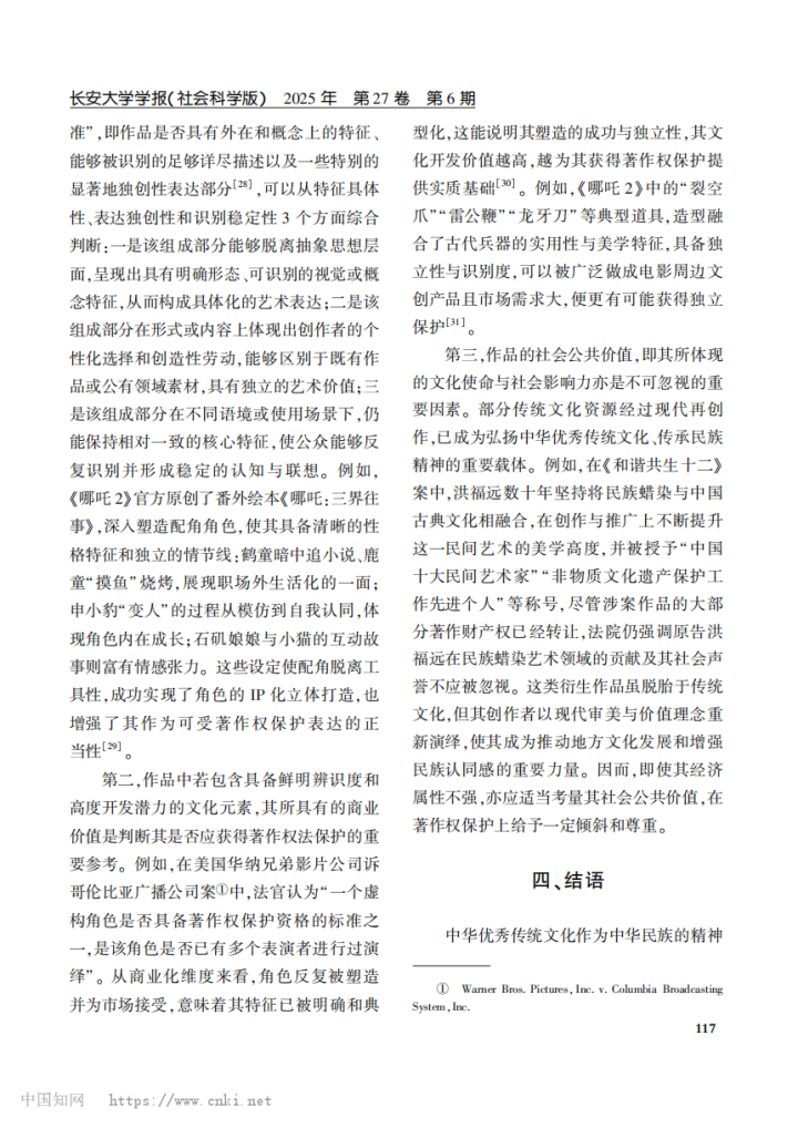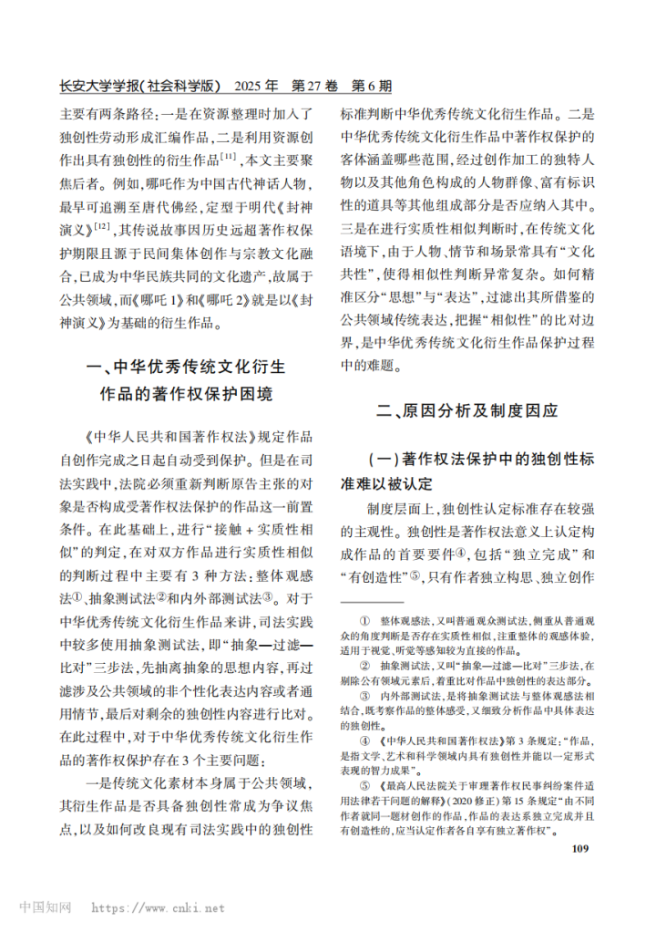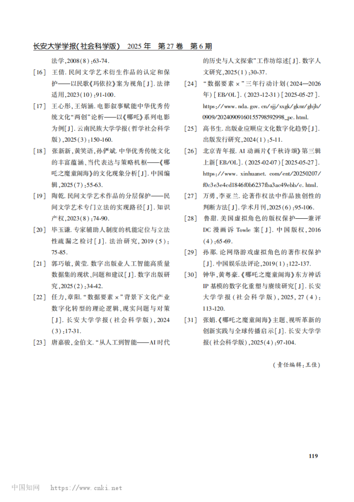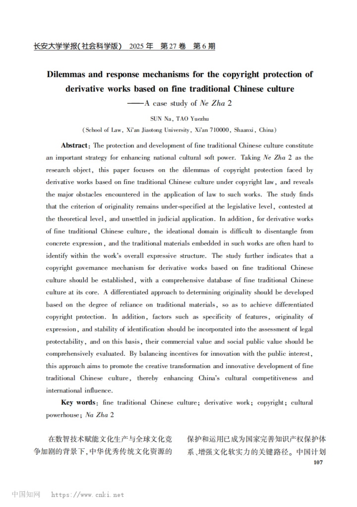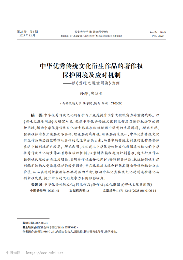 编者按:近日,《长安大学学报(社会科学版)》杂志2025年第6期发表了中心师生学术论文,题为《中华优秀传统文化衍生作品的著作权保护困境及应对机制——以《哪吒之魔童闹海》为例》。作者:孙那,西安交通大学法学院副教授、博士生导师;陶玥竹,西安交通大学法学院硕士研究生。